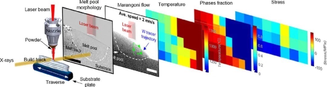 激光增材制造(LAM)由于高度柔性和用途广泛,使得层层堆积制造复杂的形状成为可能。目前该技术已经成为一种现代的制造技术,尤其是在冶金行业中。直接能量沉积增材制造(DED-AM),通过喷嘴来熔化沉积的粉末或沉积丝材,利用激光作为能量源,成为一种成本效益高和多用途的LAM制造工艺,这是因为该技术可以制造大体积的近净自由成形部件。DED-AM技术同时还可以用来进行修复航空中的高附加值的部件,在医疗和汽车行业中也有广阔的应用。然而,在DED-AM工艺过程中的快速凝固造成了几个巨大的技术上的障碍,包括显著的残余应力和形成不理想的显微组织方面的缺陷,如气孔,裂纹或大的外延生长的晶粒。这些严重的阻碍了DED-AM技术来制造安全为主要要求的工业场合的广泛应用。为了克服这些限制,需要在AM制造过程中的背后瞬时的物理机制能够得到深入的了解。试错法为基础的研究方法被用来建立起工艺状态,得到的显微组织和性能之间的关系,然而,这一办法在实践中并不理想,尤其是在应用于理解和优化控制AM制造的产品质量和随后的材料于部件性能的相互竞争的瞬时机制的时候。