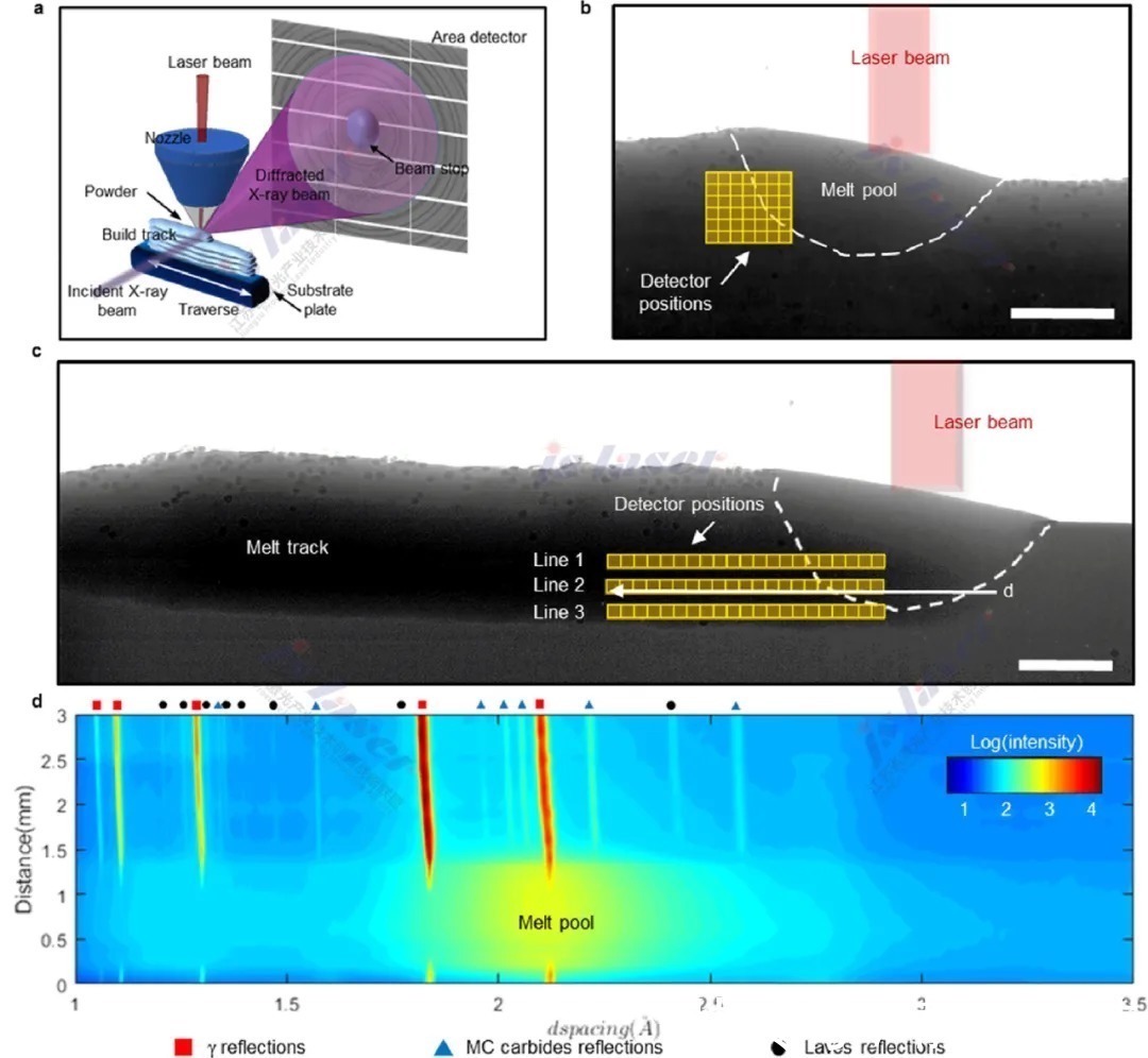 在最近,快速同步辐射X射线衍射的办法用来揭示SLM制造过程中的显微组织的演化和热温度梯度的变化,提供了采用X射线影像所不能提供的新的信息。Zhao等人展示了同步衍射可以用来捕获SLM制造过程中的相变过程。Thampy等人进一步的估计了在SLM过程中使用衍射峰漂移的时候的表面冷却速率。Hocine等人实施了一个超快衍射探头来估计相变,冷却速率和残余应力,使用的手段是在SLM制造过程中不同打印参数的衍射峰值强度的变化。尽管温度和相变可以从高度瞬时的分辨率来监控,但低的分辨率造成比较低,量化分析相变,应力和液相比例并没有被确定。此外,没有研究是关于DED-AM的应用。
