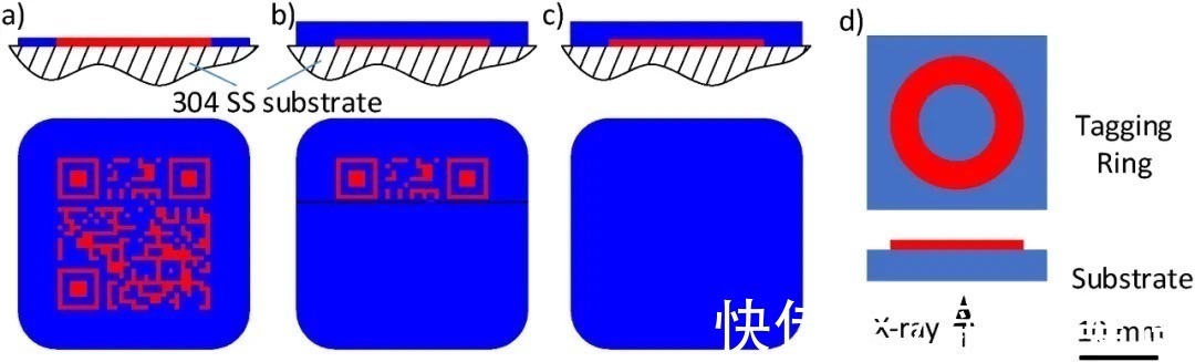 图3a) 到 c)表示的是QR代码样品 A, B, C的示意图;d) 标签环在304不锈钢基材上的示意图,在这里X射线自基材的底部发射.