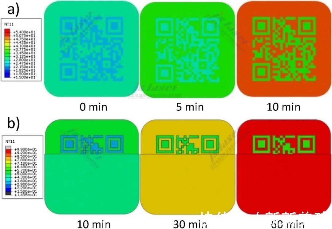 图5 a) 和 b) 暴露的QR代码随着时间的增加而模拟得到的温度分布以及部分覆盖的QR代码,采用的模拟手段为FEM模拟技术.