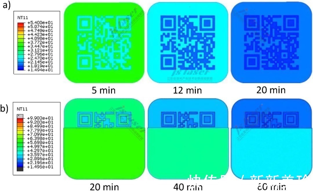 图6 QR代码随着冷却时间增加所得到的模拟温度的分布: a) 暴漏的QR代码, b) 部分覆盖的QR代码 .