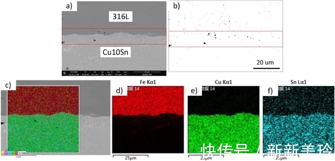 图4 316?L-Cu10Sn界面的SEM照片和EDS元素分析结果:a)316?L-Cu10Sn样品C材料界面的SEM照片;b)a中的气孔转换后的分布情况;c)316?L-Cu10Sn样品界面的EDS图像;d) - f)316?L-Cu10Sn样品界面处e, Cu, Sn元素的分布.