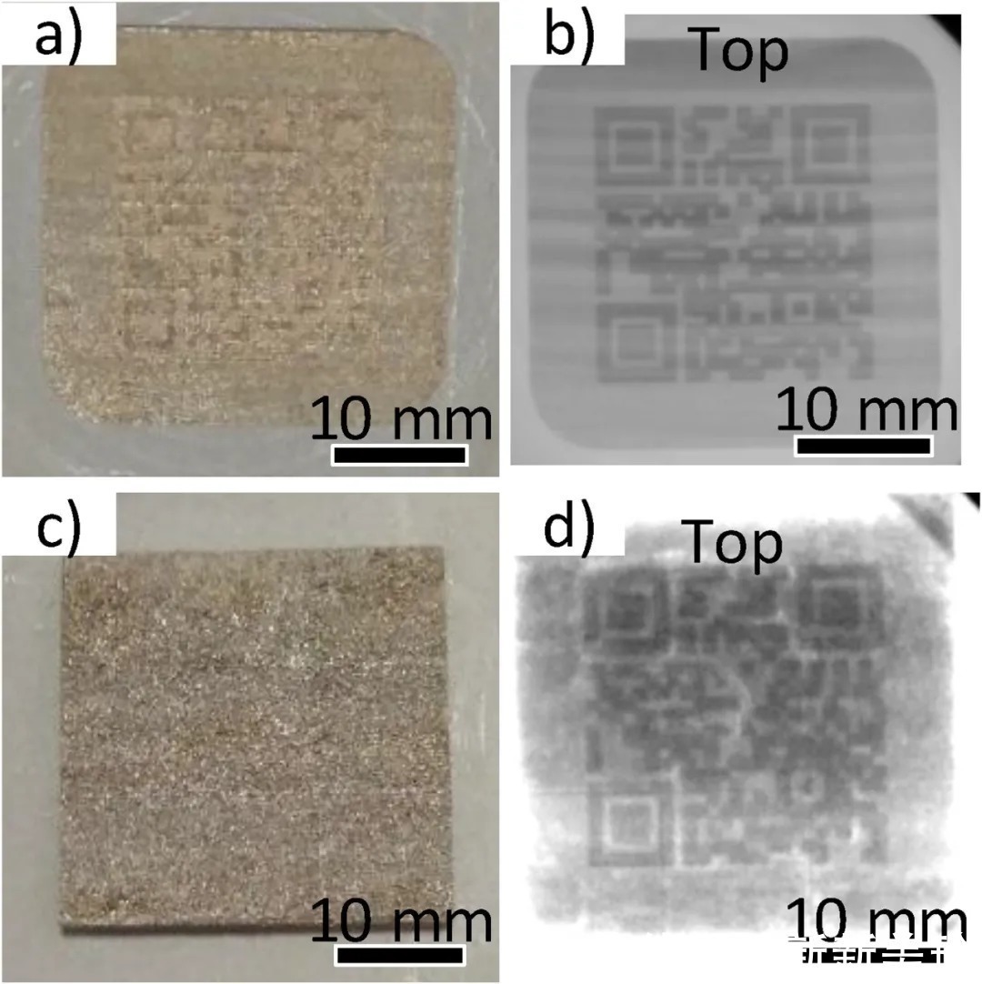曼彻斯特大学为大家展示的这一新技术,植入一种不可移除的防伪安全特征作为标签材料,不同于原始的构建材料,进入到不可接近的位置,通过AM工艺的金属打印技术来实现,该技术基于一个专利权的多元材料SLM系统来实现.三种样品的QR代码包含特定信息进行了成功的制备.令人满意的冶金结合和含有一定的气孔在316?LCu10Sn材料界面处被观察到.红外影像技术表明这一检测技术可以用来识别部件表面上的这一QR代码,识别是基于Cu10Sn 和 316?L材料的成分变化所造成的热辐射的差别,而它有可能被表面织构的差异所形成的噪音而形成干扰,包括部件的表面粗糙度.另外一方面,数字X射线影像技术可以有效的识别嵌入的标签.分子量比较大的标签材料和分子量比较小的标签材料将会在数字X射线影像中形成较大的对比度.XRF技术可以用来探测表面的标签材料或接近表面的标签材料.其探测范围可以达到毫米量级.