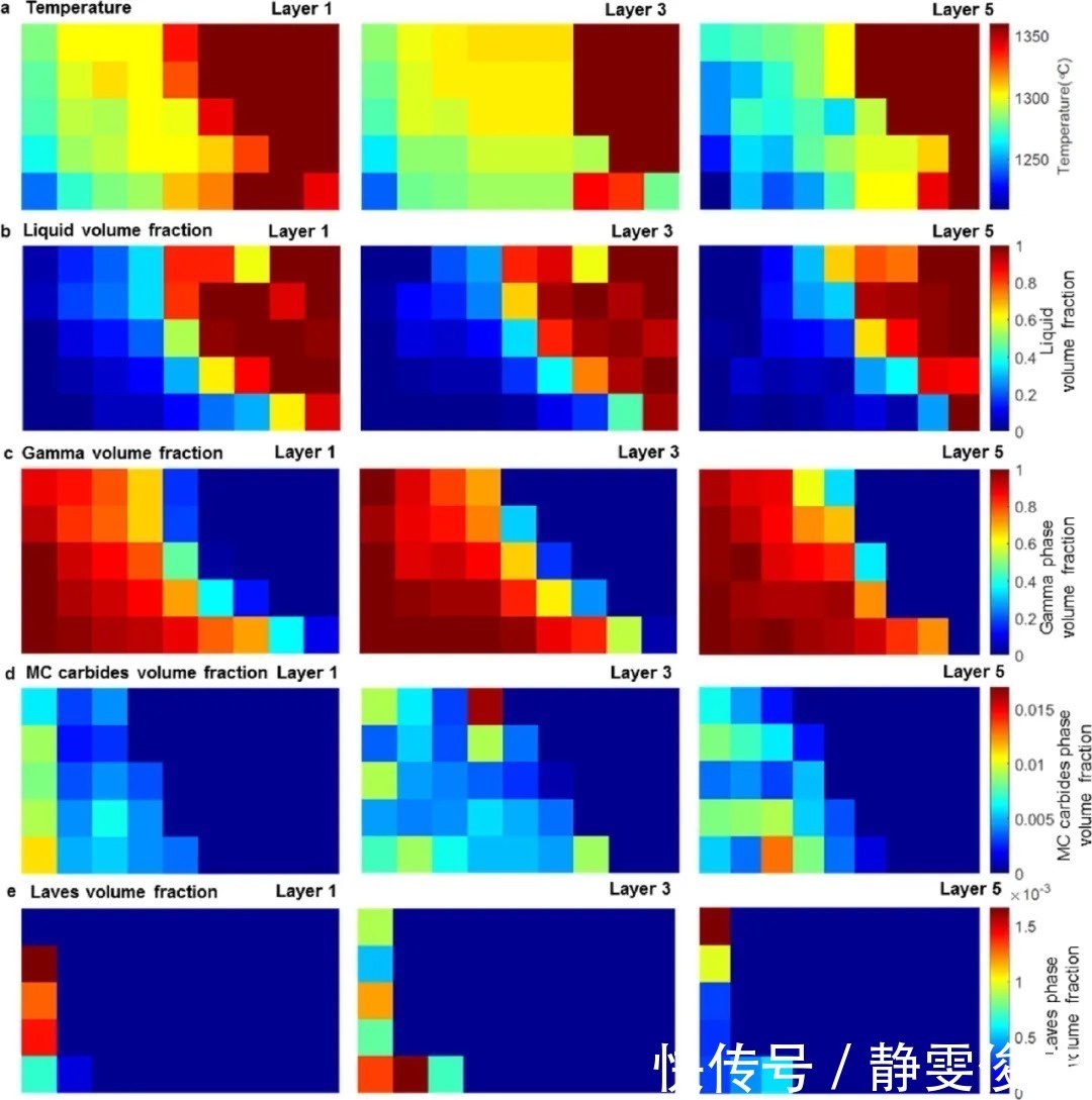 图4 衍射后得到的熔池图像表明了:(a) 温度, (b) 液相体积分数,, (c) γ 相的体积分数, (d) MC 碳化物的体积分数, (e) laves 相的体积分数在多层熔池区域的体积分数.液相体积分数的面分布结果同熔池边界的X光照相结果相吻合.