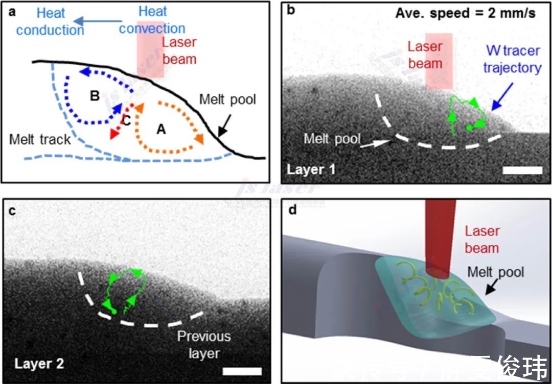 图3使用W作为追踪剂在DED-AM IN718 的时候原位操作X射线影像量化Marangoni流动